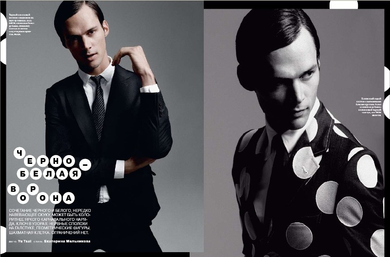 Fashion. Чёрно-белая ворона (фото Yu Tsai, стиль Екатерина Мельникова). Сочетание черного и белого, нередко навевающее скуку, может быть колоритнее яркого карнавального наряда. Ключ в узорах: нервные сполохи на галстуке, геометрические фигуры, шахматная клетка. Ограничений нет.