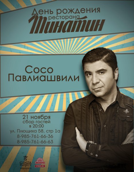 Главной изюминкой станет выступление любимого всеми Сосо Павлиашвили, а ведущей вечера будет сама хозяйка «Тинатина» - Тина Канделаки.