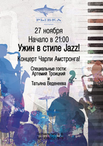 Итак, 27 ноября в «Рыбке» вас ждут Чарли Армстронг, Артемий Троицкий, Татьяна Веденеева, Бруно Марино, великолепная атмосфера джазового вечера, прекрасное общение и уникальное меню, приготовленное прямо у вас на глазах.