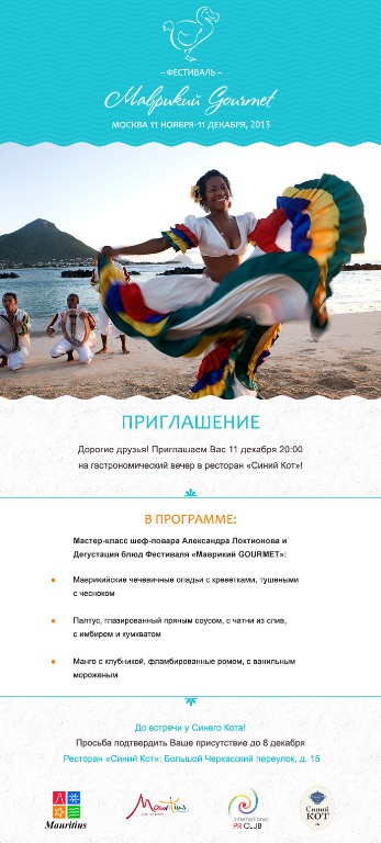 В программе вечера – мастер класс шеф-повара Александра Лактионова по приготовлению удивительных маврикийских блюд и десерта, а также дегустация меню фестиваля «Маврикий Gourmet».