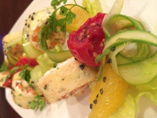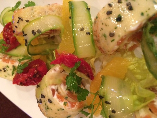 Блины фаршированные подкопченным лососем с салатом из спаржи и апельсина (595 р.)