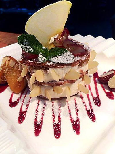 Мильфей из каштанов с кремом из рикотты, медом и винным соусом (393 р.)
