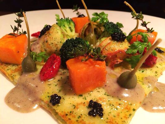 Блины фаршированные дорадо,овощами и соусом из трюфеля (858 р.)