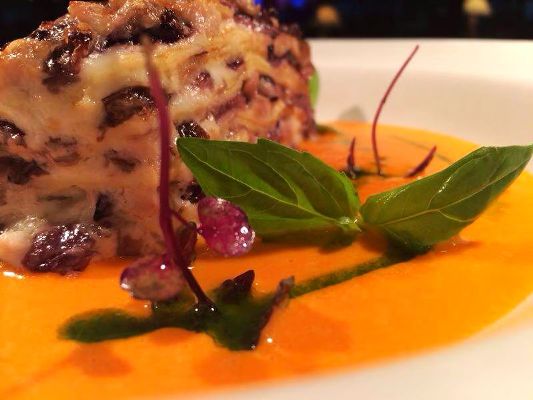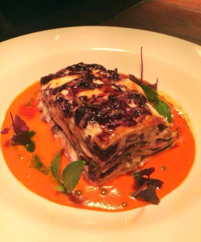 Лазанья из блинов с радичио, курицей в травах и соусом из красного перца (505 р.)