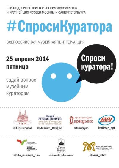 25 апреля при поддержке официального твиттера Российской Федерации (@TwitterRussia) стартует акция на русском языке #СпросиКуратора — аналог крупнейшего международного твит-проекта о музеях. Акция дает уникальную возможность узнать о музеях «из первых рук», напрямую задав интересующие вопросы сотрудникам музея.