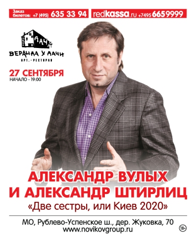 В загородном ресторане «Веранда у Дачи» с программой «Две сестры, или Киев 2020» выступит уникальный дуэт – Александр Вулых и Саша Штирлиц. Экстравагантный поэт Александр Вулых сегодня занимает видное место на небосклоне российской поэзии. Его стихам присущи тонкая ирония, переплетенная с акварельной лирикой, и изящный легкий поэтический слог, пропитанный разнообразными вкусовыми оттенками современного русского языка. Не исключена и ненормативная лексика.
