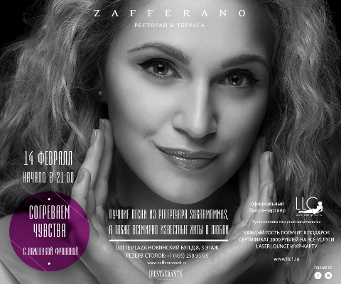 Во всех ресторанах сети гостей встретят комплиментами от шеф-повара и сюрпризами. В Zafferano, расположенном в Lotte Plaza, выступит Анжелика Фролова, начало в 21:00. Жизнерадостная девушка с сильным и чистым голосом исполнит всемирно известные хиты о самом прекрасном чувстве на свете. А представители официального бьюти-партнера вечера – клиники лазерной эпиляции и косметологии Laser Lounge Clinic – вручат присутствующим подарочные сертификаты номиналом 2000 рублей, или VIP карты постоянного гостя. В ресторанах Zafferano в ТРК «Vegas Крокус Сити» и в ТРК Vegas влюбленных ждут подарки в виде фотомагнитов и романтическая атмосфера.