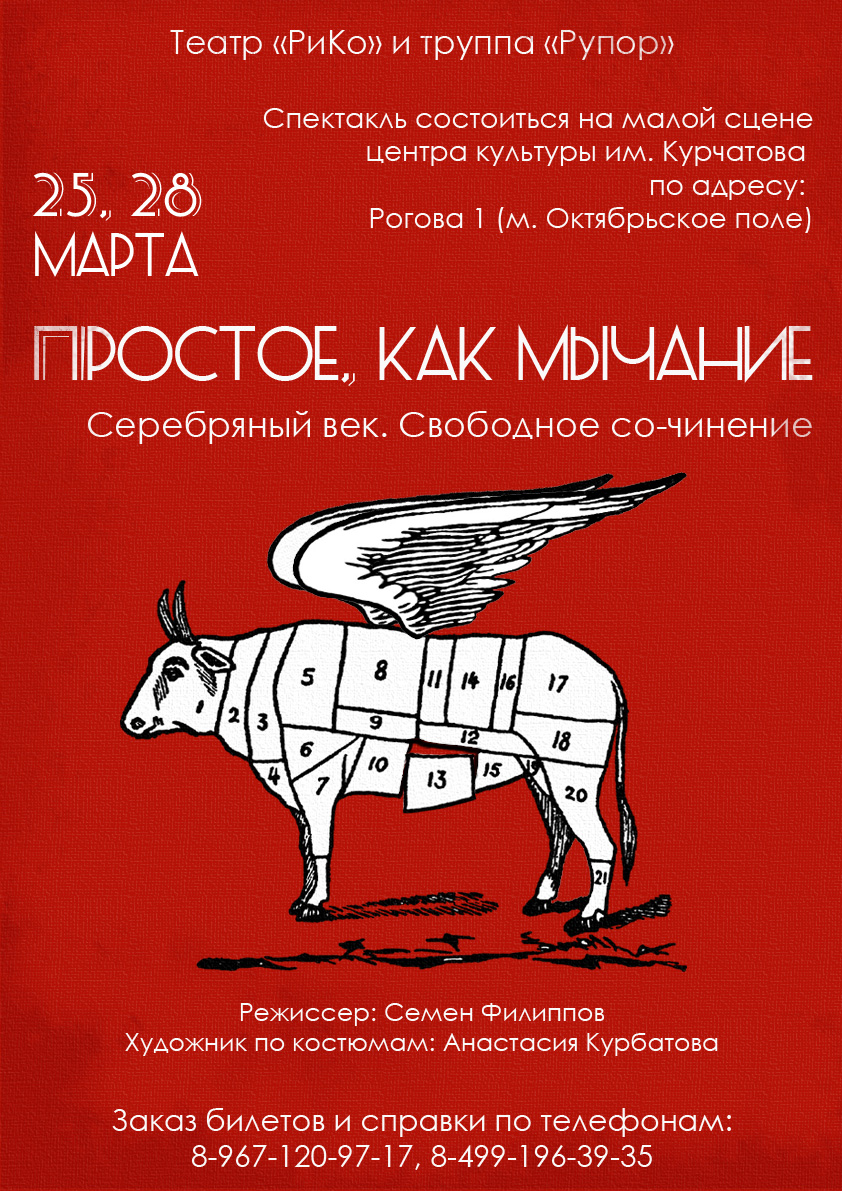 Первый спектакль «Честного театра РУПОР» – «Простое, как мычание», посвящен Серебряному веку. Это не вечер стихов, а полноценный спектакль, в котором исследуются культурный срез эпохи Серебряного века. Одна из задач создателей спектакля «Простое, как мычание» – найти и заново восстановить истинный смысл русского слова и поэтического образа.
