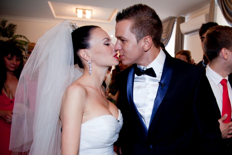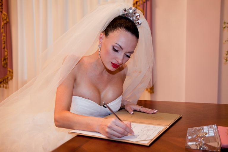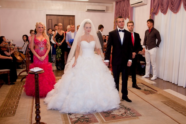 Обо всем по порядку. Перед зданием ЗАГСа Женя появилась в шикарном платье с диадемой на голове и длинной-предлинной фатой. Жених выглядел чуть скромнее: водолазка, спортивные штаны и сандалии с белыми носками. Шутка. Антон был в элегантном (очень дорогом) костюме с забавной (на самом деле тоже очень дорогой) бабочкой. Первый семейный скандал состоялся прямо перед росписью: Антон случайно наступил на белоснежное платье невесты и оторвал от него маленький кусочек ткани. После этого последовало заслуженное (по мнению Жени) наказание: пощечина и немного нецензурщины. Но никто даже и внимания не обратил, ведь милые бранятся – только тешатся.