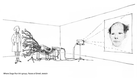 В инсталляции «Лица Запаха» группы «Куда бегут собаки» многочисленные нюхательные трубки газоанализирующих датчиков исследуют ароматический портрет посетителя, который затем визуализируется с помощью фоторобота. Возможность этой странной встречи с новым образом самого себя требует овладения неуловимой материей запаха, сопротивляющейся символической записи. Для этого потребовалась беспрецедентная по масштабам работа интернациональной команды инженеров и производителей.