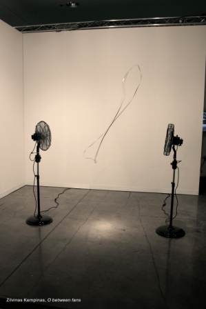 Американской художник литовского происхождения Жильвинас Кемпинас демонстрирует визуальную головоломку, составленную из двух вентиляторов и непрерывно кружащейся между ними в воздухе ленты-бобины для катушечного магнитофона. Машинерия расшифровки аудио- и видео-образов, запрятанная под корпусом проигрывателя, оказалась вынесена наружу, в то время как изображение и звук, закодированные на пленке, теперь отданы самим себе и воображению зрителя.