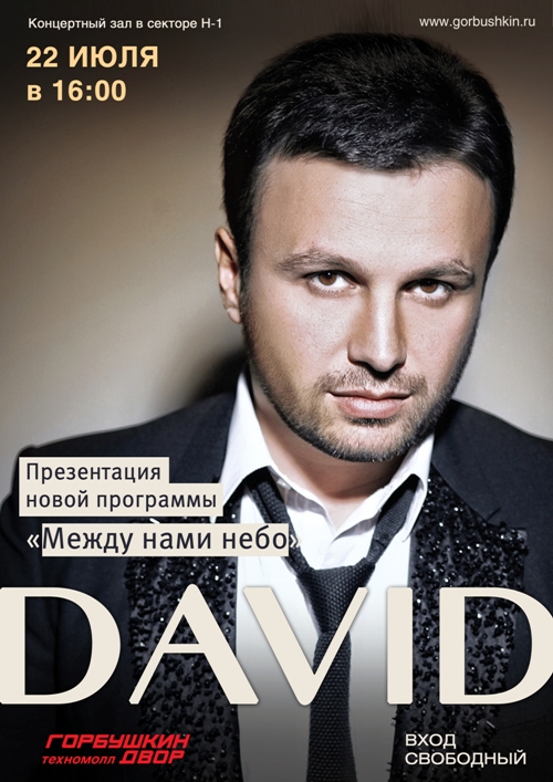 Новая программа David'a «Между нами небо» состоит из разных песен – есть романтичные и медленные, есть быстрые и зажигательные. Потрясающая сумасшедшая энергетика, оригинальность и особая романтическая атмосфера не оставит вас равнодушными.
