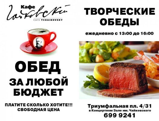 При этом кафе «Чайковский» дает гостям самим устанавливать цену за обед. Если все понравилось - и еда, и обслуживание, можно оставить хоть 500 рублей, если же гость остался чем-то не совсем доволен, то можно оценить обед и в 50 рублей. Теперь все гости кафе станут полноправным критиками и судьями, и смогут как наградить, так и наказать своим рублем.