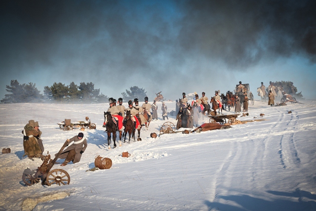 Примечательно, что центральным персонажем в самых первых кадрах, отснятых съемочной группой, был Александр Первый – снимали сцену в Царском селе, где государь советовался со своим секретарем, заключать ли мир с Наполеоном, когда тот уже прилагал дипломатические усилия для того, чтобы подписать мирный договор с Россией. Это почти самый конец войны. Тогда Александр принял решение воевать до победного конца, чтобы потом маршировать по Елисейским полям. В последний съемочный день снимали в Михайловском замке, изображавшем город Вильно, в котором российский император находился 22 июня 1812 года, где и встретил известие о начале войны. Это совпадение случайно, но выглядит оно символично – съемочная группа пережила всю войну, от конца до начала.