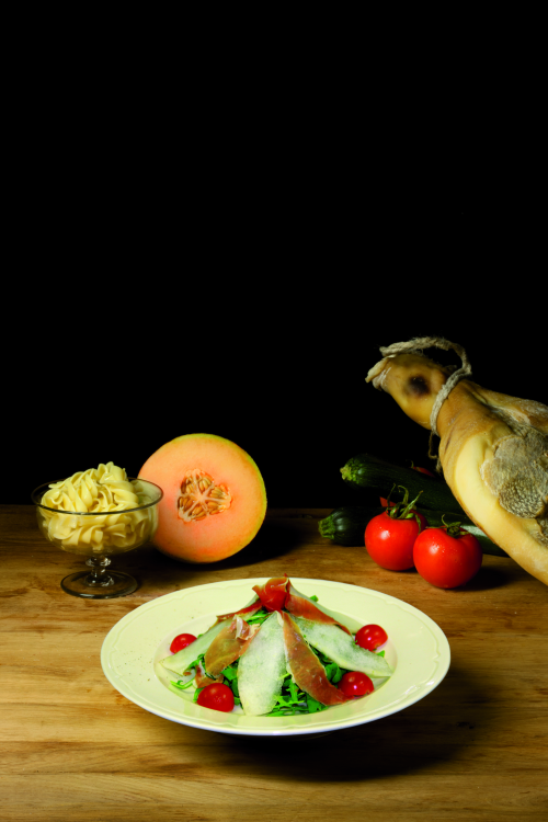 Салат с дыней и сыровяленным окороком (349 руб.), салат с арбузом (199 руб.), лимонад из дыни (600 мл. - 449 руб.), лимонад из арбуза (600 мл. – 449 руб.).
