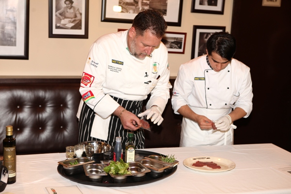 В начале гала-ужина гостям Goodmanа была подана закуска – карпаччо из говяжьей вырезки с микс-салатом из листьев радичио, лолло россо, лолло бьондо и фризе. «Я заправляю его оливковым маслом и молотым перцем, - пояснил Томас, - украшаю соцветиями спаржи, помидорами черри, ломтиками редиски и тончайшими листиками пармезана, а поверх посыпаю небольшим количеством розовой соли. Не забудьте добавить обжаренные кедровые орешки! Хорошим дополнением к этому блюду послужит немного трюфельного масла, а последним штрихом будет выпаренный бальзамический уксус. Это блюдо очень просто в приготовлении, каждый может попробовать сделать его сам».