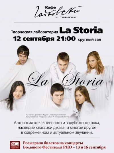 Творческая лаборатория «Ла Стория» – это секстет профессиональных актеров и музыкантов в одном лице. Лауреаты всероссийских и международных конкурсов и фестивалей. Участники самого большого в мире международного фестиваля искусств Fringe в городе Эдинбург участники конкурса "Новая волна". В концертных программах исполняют известные вещи самых популярных российских и западных исполнителей. При исполнении вокалисты ломают традиционное звучание, делая звучание современным и актуальным.