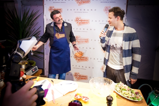 Опытный кулинар Михаил Плотников на глазах у изумленных зрителей и звездных гостей дал мастер-класс по приготовлению раков в медовом соусе и удивительного салата из инжира своей ученице и соведущей - Анне Семенович.