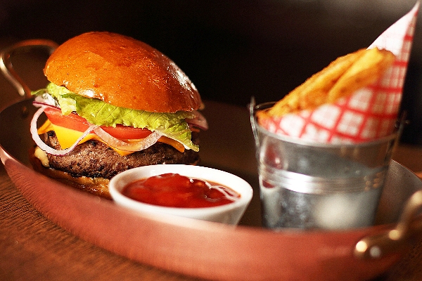 Основа бургера - натуральная котлета из американской говядины US Black Angus Prime с швейцарским сыром, свежим салатом, ломтиком помидора, луком и пикулем. Все это гастрономическое великолепие подается в свежайшей булочке бриош, собственной выпечки, с картофелем фри. В дополнении, гости могут выбрать по своему усмотрению суп или салат.