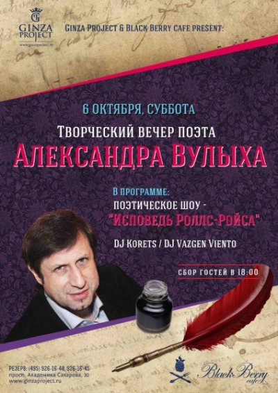 В его основе лежат занимательные поэтические истории и рассказы, которые моментально пленят зрителя своей неповторимостью и доступностью, заводят его с полуоборота, вовлекая в череду интересных и забавных событий, одновременно позволяя расслабиться. Поэтические шоу Александра Вулыха с легендарными "Исповедь Роллс-Ройса" и "Пятница 13" пользуются большой популярностью в московских арт-кафе и клубах.