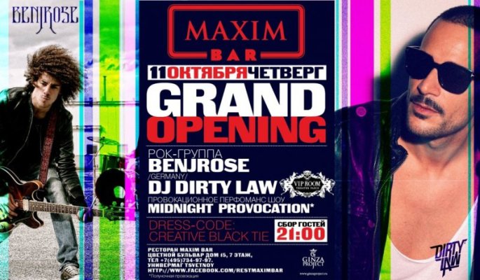 Grand opening ресторана Maxim Bar откроет концерт эпатажной немецкой рок-группы Benjrose и презентация нового осенне-зимнего меню от дуэта шеф-поваров Андрея Коробяка и Андрея Орлова. После полуночи гости увидят провокационное шоу Midnight Provocation и динамичное лазерное шоу. За музыкальное настроение ночи и танца будет отвечать проверенный любимчик мирового бомонда и звездный резидент парижского клуба VIP ROOM dj Dirty Law, чья музыка отлично сочетается с эксклюзивной коктейльной картой Maxim Bar, которая представлена лондонским миксологом Беком Нарзи.