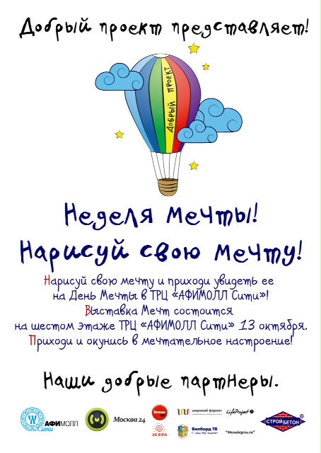 "Добрый проект" от ТРЦ Афимолл Сити адресован всем молодым жителям мегаполиса. Проект предоставит своим участникам бесценную возможность задуматься о сокровенной мечте, красочно представить ее себе и изобразить на бумаге, тем самым, сделав первый шаг к ее реализации. "Неделя мечты" напомнит москвичам о том, как важно воплощать свои мечты, не откладывая их на неопределенный срок.