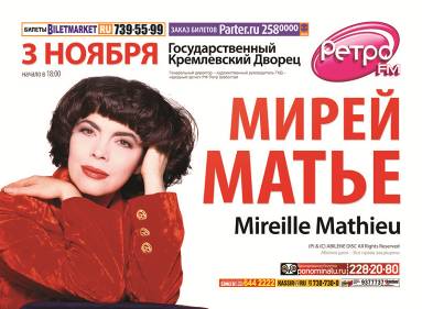 3 ноября в Кремле Мирей Матье представит многочисленным российским поклонникам новую программу, в которой прозвучат не только признанные хиты, но и редко исполняемые композиции. Звезда французского шансона выступит в сопровождении эстрадного оркестра под руководством Жана Кладрика, также вместе с Мирей Матье на сцену выйдет великолепный тенор Фабрис Ламо.