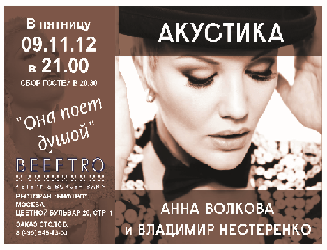 С акустическим концертом выступит неподражаемая Анна Волкова и Владимир Нестеренко c программой «Она поет душой».