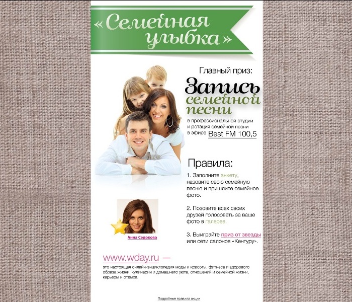 Жюри в составе редакции радиостанции Best FM и редакции портала WDay.ru выберет из 10-ти одного лучшего и вручит ему главный приз – ЗАПИСЬ СЕМЕЙНОЙ ПЕСНИ в профессиональной студии Best FM и недельную ротацию фрагмента песни в эфире Best FM 100,5!