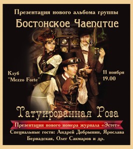 11 ноября 2012 г. в клубе «Mezzo Forte» (Москва) состоится презентация нового альбома группы «Бостонское чаепитие» и нового номера журнала «Эстет», посвященного ароматам и парфюмерии.