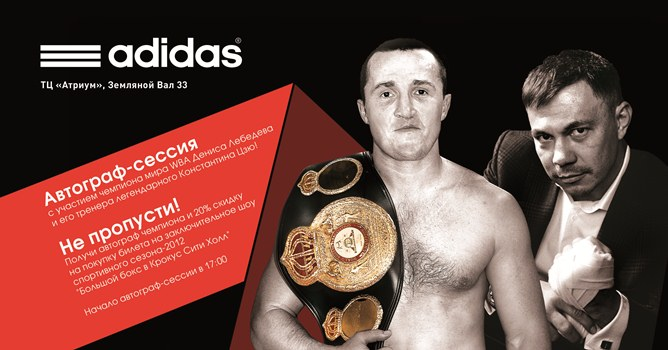 Кроме того, в этот день всех поклонников большого бокса и Adidas ждет еще один сюрприз. Начиная с 7 декабря и по 17 декабря каждому покупателю, совершившему любую покупку в любом из магазинов Adidas, предоставляется 20-процентная скидка на приобретение билета на финальное спортивное шоу сезона-2012 «Большой бокс в Крокус Сити Холл».