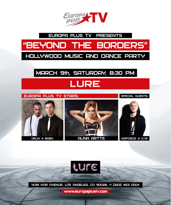 9 марта (а не 3 марта, как было объявлено ранее), в субботу, в модном клубе Lure в Лос-Анджелесе прогремит вечеринка “Beyond the borders” телеканала Europa Plus TV. Событие пройдет при участии яркой российской исполнительницы Алины Артц, популярного американского музыканта Kidforce и молодого болгарского коллектива Orlin & Bobo. Алина Артц – российская певица, артистка и телеведущая. Исполнительница хитов «Танцуй, чтобы жить!», «It’s Alright», «Прекрасная ложь», «Дыши глубже», «LA» и «Со мной по-другому нельзя». Видеоклипы, выпущенные в поддержку её сольного альбома, в кротчайшие сроки набрали более 2 миллионов просмотров в интернете. Несмотря на активную музыкальную деятельность, Алина ведет свои проекты на телевидении, примеряет на себя роли в кино и участвует в музыкально-акробатических постановках.