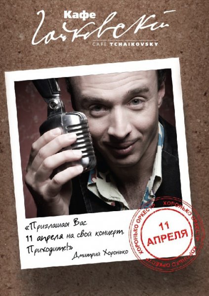 17 мая Виктор Добронравов, известный по ролям в фильмах "Антикиллер-2","Побег", "Кодекс чести", ролям в театре им. Евг. Вахтангова "За двумя зайцами", "Царская охота" а также нашумевшему сериалу "Не родись красивой" выступит с сольной музыкальной программой на сцене кафе "Чайковский".