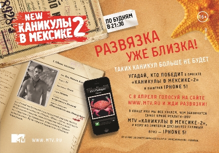 С 8 апреля на сайте www.mtv.ru стартует конкурсное голосование среди зрителей реалити-шоу. Каждый желающий сможет проголосовать за того участника проекта, который, по его мнению, будет удостоен главного приза, и оставить свой комментарий в адрес претендента. Победитель второго сезона реалити-шоу «Каникулы в Мексике» сам выберет лучший из оставленных ему комментариев и назовет его автора. Счастливчика ждет завидная награда – Iphone 5! Еще 20 участников голосования, угадавших победителя, получат памятные призы. Как и любые каникулы, «Каникулы в Мексике-2» заканчиваются, но заканчиваются они по-мексикански жарко.