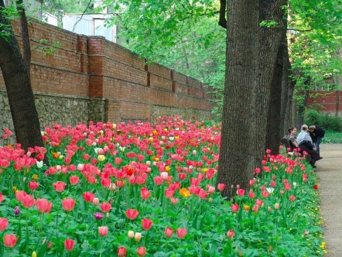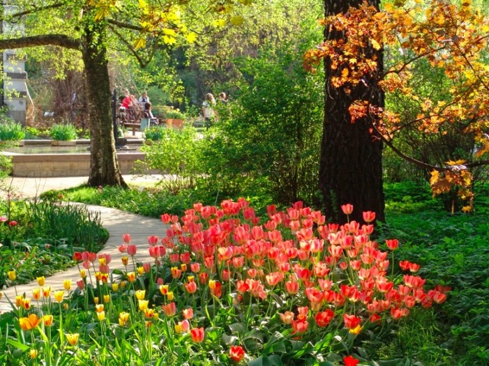 В первые дни мая на смену первоцветам приходят десятки тысяч тюльпанов, нарциссов, гиацинтов, рябчиков-фритиллярий и других луковичных растений.
