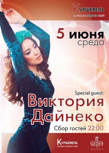 Виктория Дайнеко – популярная российская певица. Будучи участницей известного шоу-проекта «Фабрика звезд – 5», чувственным исполнением и красотой покорила сердца многих. Виктория Дайнеко обладает ярким, запоминающимся вокалом, прекрасно танцует, а каждое свое выступление превращает в уникальное шоу. Хотите в этом убедиться? Добро пожаловать в «Куршевель» 5 июня!