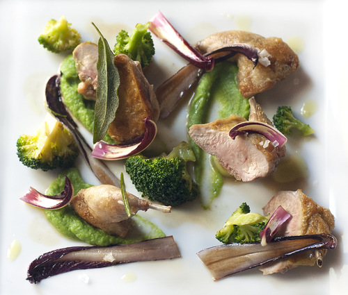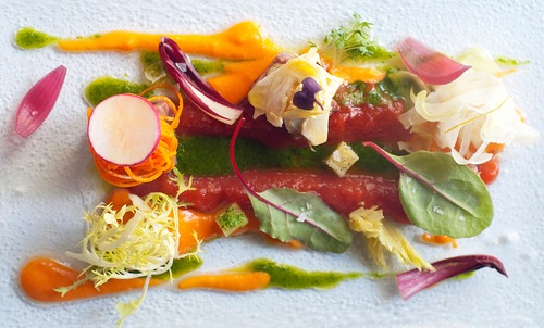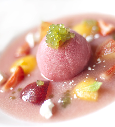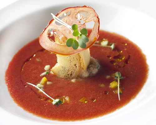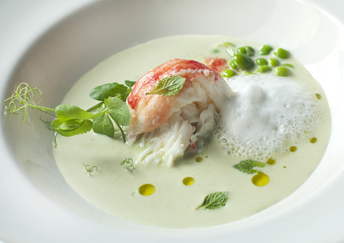 Легкий салат из телятины с имбирем и овощами повар-провокатор умудряется подавать с мармеладом из оливкового масла. Насыщенный гаспачо – с панцанеллой и тартаром из овощей, а яркий по цвету и по вкусу холодный суп-пюре из зеленого горошка и мяты – с крабовым мясом.