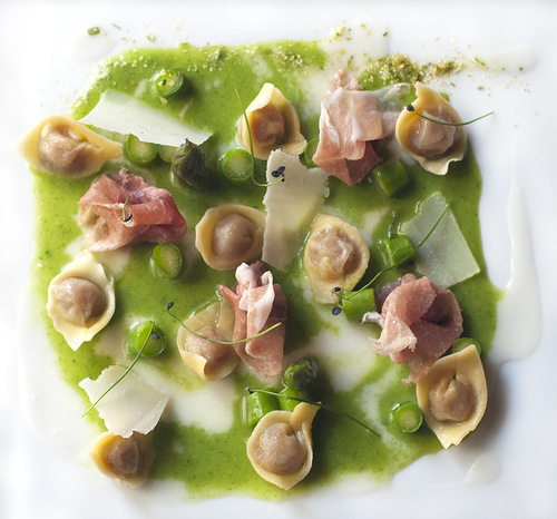 С вяленой ветчиной Мирко Дзаго готовит пасту тортеллини. Ее вкус дополняют пармезан и соус из спаржи. Нежное филе дорадо с помидорами, зелеными бобами и мятой – еще одна летняя новинка. На десерт – ароматный и свежий персиковый суп с сорбетом из красной смородины.