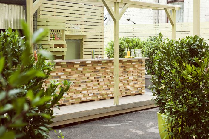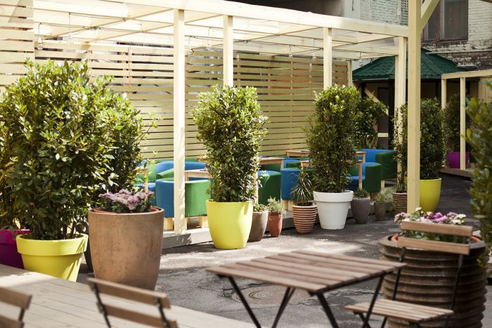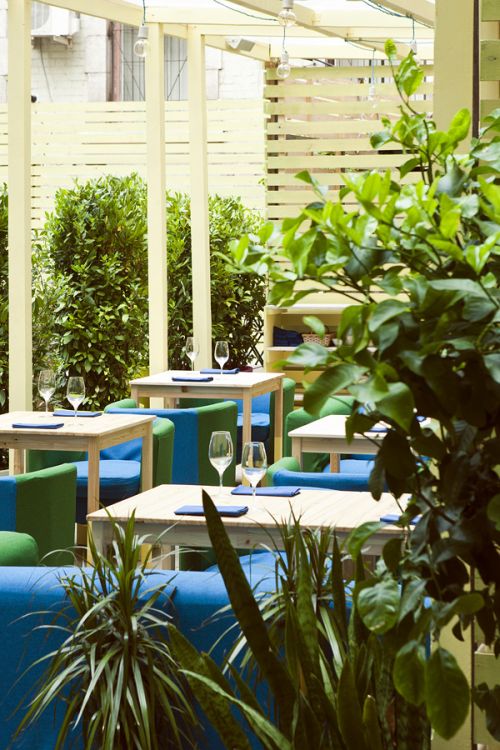 Площадка представляет собой уютный дворик, с большим количеством зелени и мебелью, выполненной исключительно из дерева. Особое внимание стоит обратить на бар, за которым можно пропустить по паре авторских коктейлей, и понаблюдать, как компания барменов изобретает новый шедевр, поверьте, здесь знают рецепты на все случаи жизни!