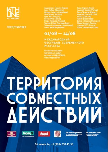 Центральным проектом фестиваля станет международная выставка с одноименным названием «Территория совместных действий». Она будет представлена одновременно в Арт-центре Makaronka и галерее современного искусства 16thLINE.