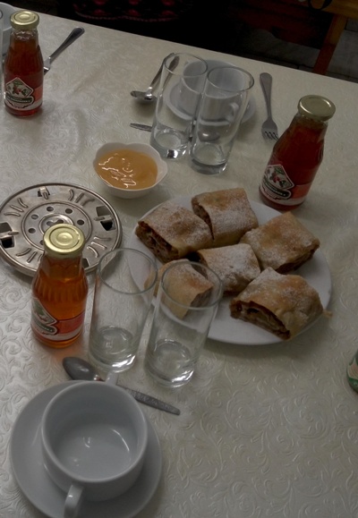 Успенский пост – время созревания плодов, появления грибов, поэтому так много их в меню этого периода. На постной трапезе были представлены следующие блюда: салат из корня сельдерея, моркови и яблока с медом, ботвинья по-монастырски, зеленые щи из свекольной ботвы с пастернаком, голубцы с перловкой и лесными грибами под соусом и постный яблочный штрудель.