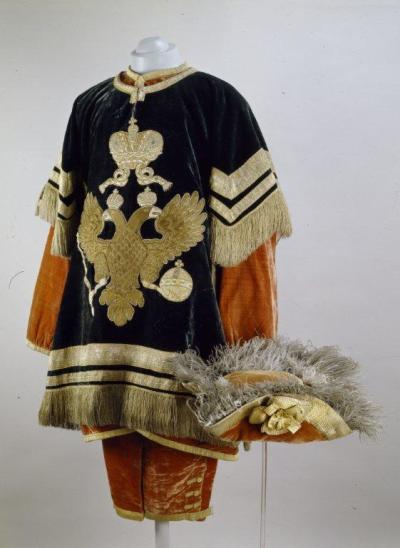 Кафтан: бархат, тафта, галун и бахрома золотные, лента, шелковые нити; ткачество, плетение, шитье