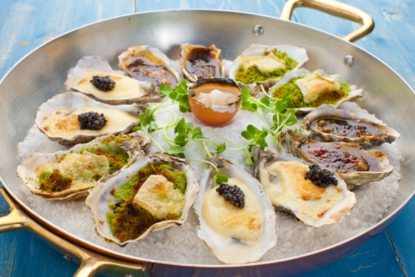 Можно выбрать один из двух предлагаемых плато: первое включает в себя 12 запеченных разными способами устриц (под соусом «Термидор», с тайским соусом, с соусом «Бри» и с чесночным соусом) с двумя бокалами игристого Botter Prosecco Spumante.
