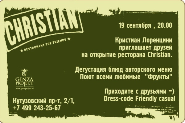 Кристиан прошел огромный путь до открытия собственного ресторана. И вот наконец-то его мечта сбылась! Поэтому меню ресторана – авторское. В него вошли любимые блюда семьи и друзей. В день открытия предоставляется уникальная возможность попробовать Christian на вкус. Уже на входе гостей встретит шеф Кристиан Лоренцини. Он будет успевать везде, но не пропустите тот момент, когда на открытой кухне лично вам в тарелку он положит главное праздничное блюдо.