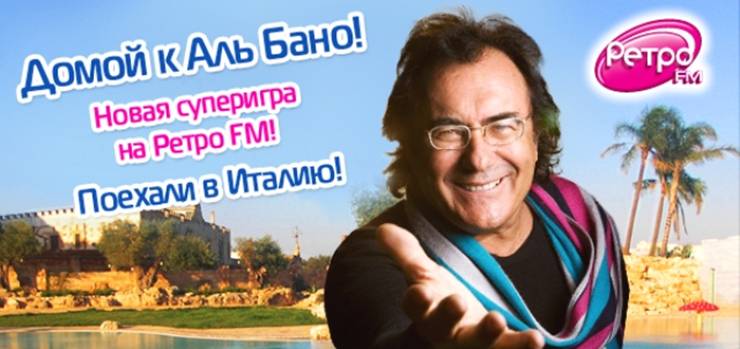 Подружиться с живой легендой, провести несколько дней в гостях у любимого артиста – такой шанс выпадает только раз в жизни! И «Ретро FM» предоставляет этот шанс всем! Присоединиться к фантастическим итальянским каникулам очень просто. Нужно всего лишь внимательно слушать радио, чтобы не пропустить очередную суперигру «Домой к Аль Бано», которая может появиться в эфире в любой момент!
