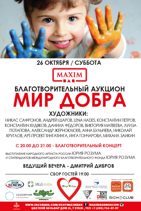 В этот вечер под крышей Maxim Bar соберутся неравнодушные люди – бизнесмены, артисты, спортсмены, представители модельного и шоу бизнеса, а также художники и музыканты, чтобы помочь сделать счастливее несколько десятков детей из детского дом «Надежда» города Электросталь ( www.facebook.com/HelpDetDomNadezda?fref=ts).