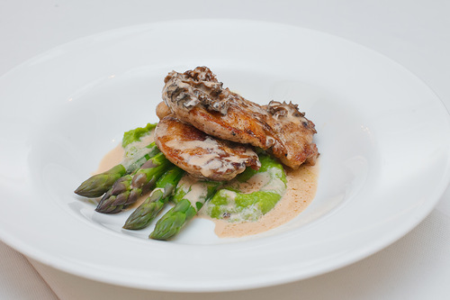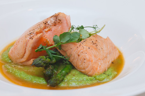 Новинкой этой осени стало филе лосося, которое шеф Юрий Рожков готовит согласно технологии sous vide (в переводе с французского – «под вакуумом») и подает со спаржей и пюре из зеленого горошка.