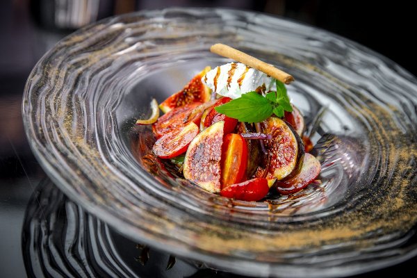 На закуску предлагается: «Листья салата Романо с подкопченными белыми грибами и кунжутным соусом», «Салат из томатов Датерини, красного лука с инжиром и крем-сыром Шавру» и оригинальный «Тар-тар из подкопченной утиной грудки со сладким виноградом и бальзамической икрой».