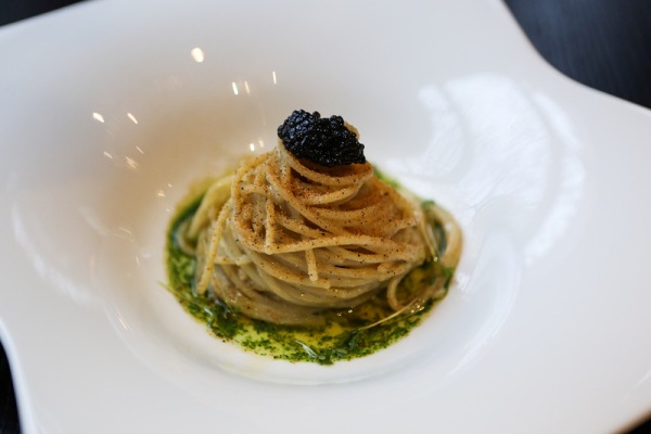 • Спагетти в устричном соусе с осетровой икрой и эмульсией петрушки