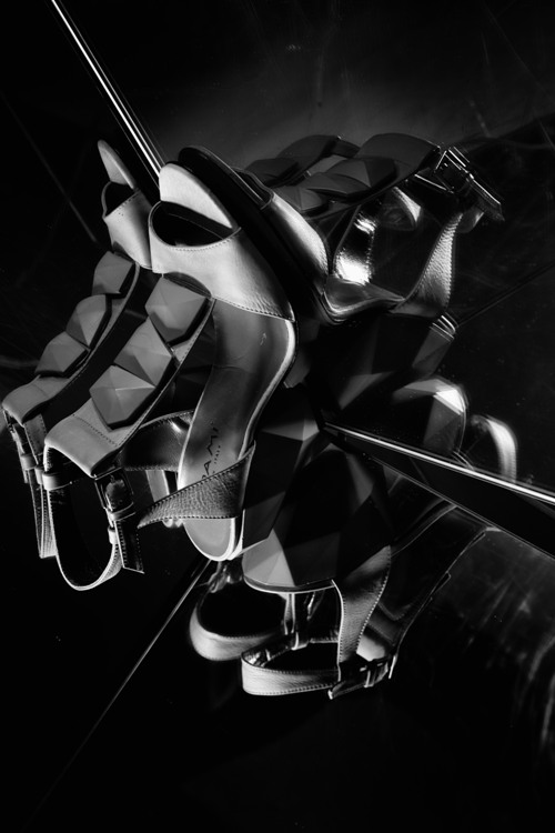 Классические, но в тоже время поражающие воображение формой каблука, они передают всю многогранность женских образов коллекции. Строгие геометрические линии и архитектурность, благодаря которым каблук кажется собранным из осколков минералов, отполированных почти до зеркального блеска, навеяны работами художника Ксавье Велана (Xavier Veilhan). Все модели туфель и ботильонов выполнены в матовых, природных оттенках черного, серого цветов.
